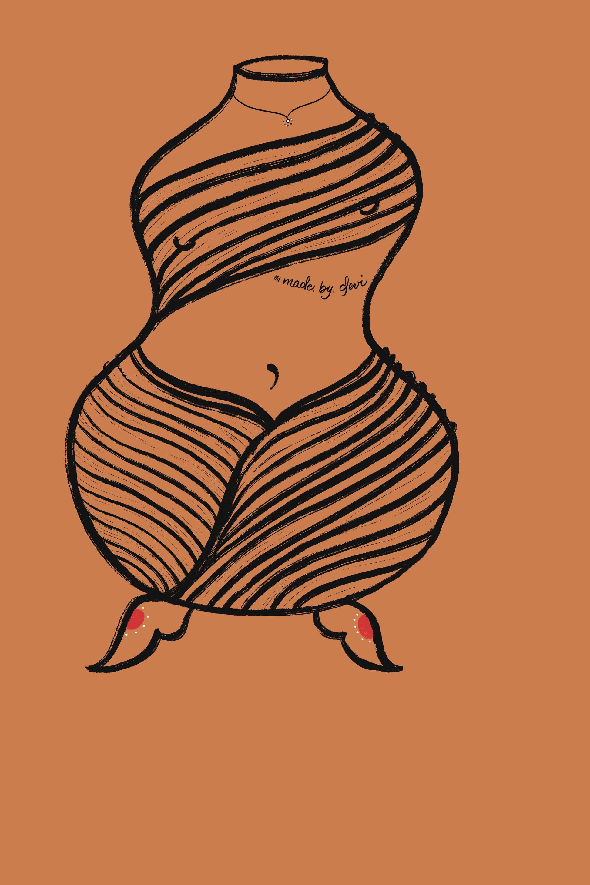 Devina thinks ceramic vases make beautiful sculptures to represent bodies. She uses a south asian motif - saree, a long draped cloth - to exentuate the ceramic vessels curves. This design can be used to adorn your home, laptop, waterbottle, local stop sign.